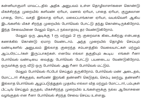 Marthandam, Kanyakumari District .REENA BOREWELLS is equipped with world best compressor and India's no. 1 rig mast (KLR).Our is the one of the best bore well drilling machinery unit in Tamil Nadu, India. Advantage with us is , even in any critical formation conditions also our rig can drill up to the maximum depth. Other technical advantage with us is Dust Controlling Equipment and Automatically water injection system. Our technical staff is very much efficient in operating this system, which is the most unique feature with our HYDRALIC SUPER RIG. Reena Borewells, a unique venture by a veteran professional, It aims to serve the Motherland to benefit millions of people. We locate waterwell points, undertake drilling of waterwells and fix up submersible pumps and to help the people by our humble work and extensive knowledge. |